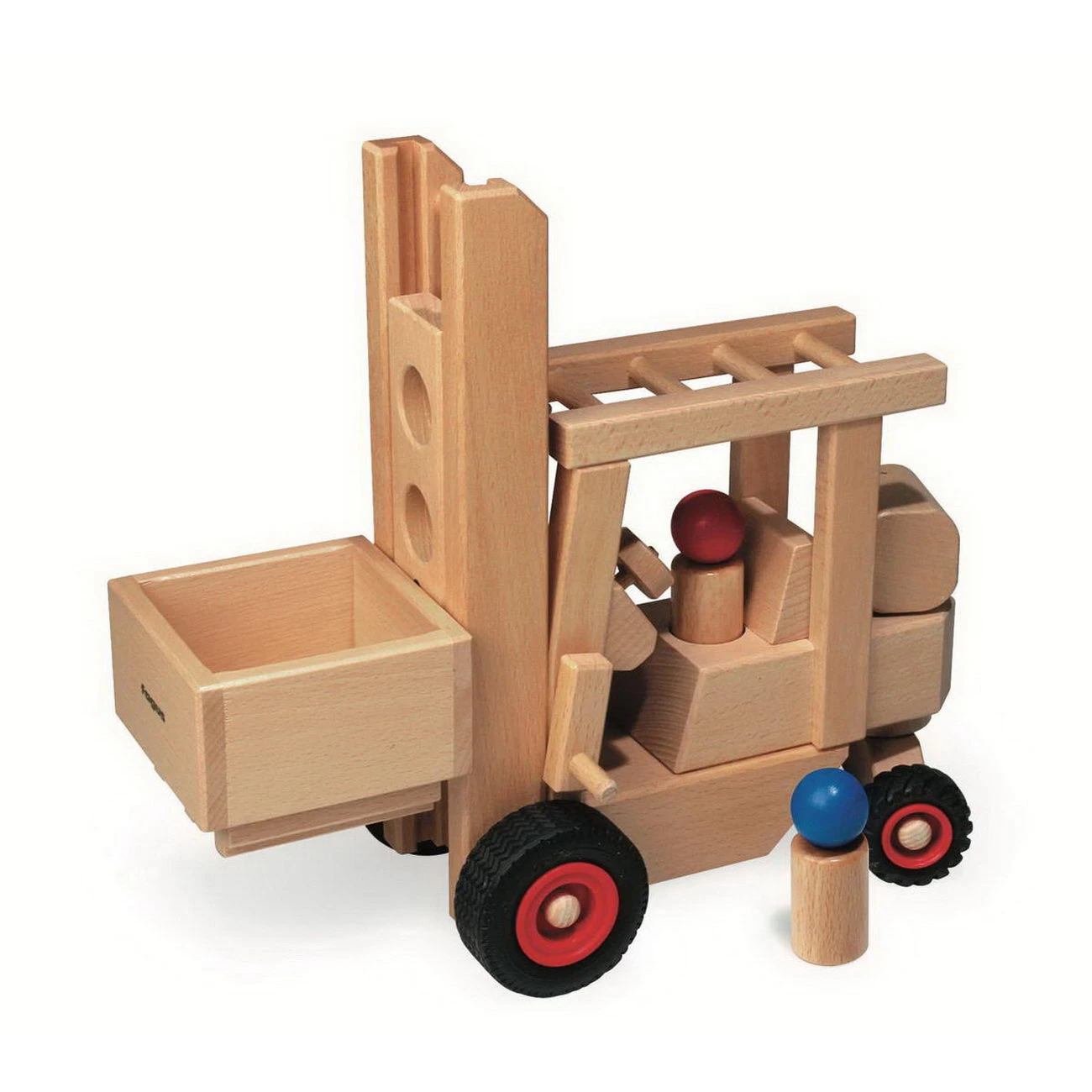 Der Gabelstapler nimmt mühelos Ladung auf und sorgt für einen reibungslosen Ablauf auf der Baustelle. Das Fahrzeug ist lenkbar. Die Ladegabel wird mit einer Kurbel stufenlos nach oben und unten bewegt. Zwei Fahrer (rot und blau) und eine Europalette sind im Lieferumfang enthalten.