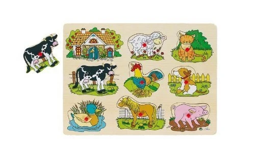 Zunächst einmal gibt es ganz klassisch acht verschiedene Puzzleteile – Schaf, Katze, Kuh, Hahn, Hund, Ente, Pferd und Schwein – die mit kleinen Griffen versehen sind und in die passenden Aussparungen eingepasst werden können. Doch sobald man eins der Teile entnimmt, ertönt ein dem Bauernhof Tier entsprechendes Geräusch! Ein Riesenspaß für die Kleinen!