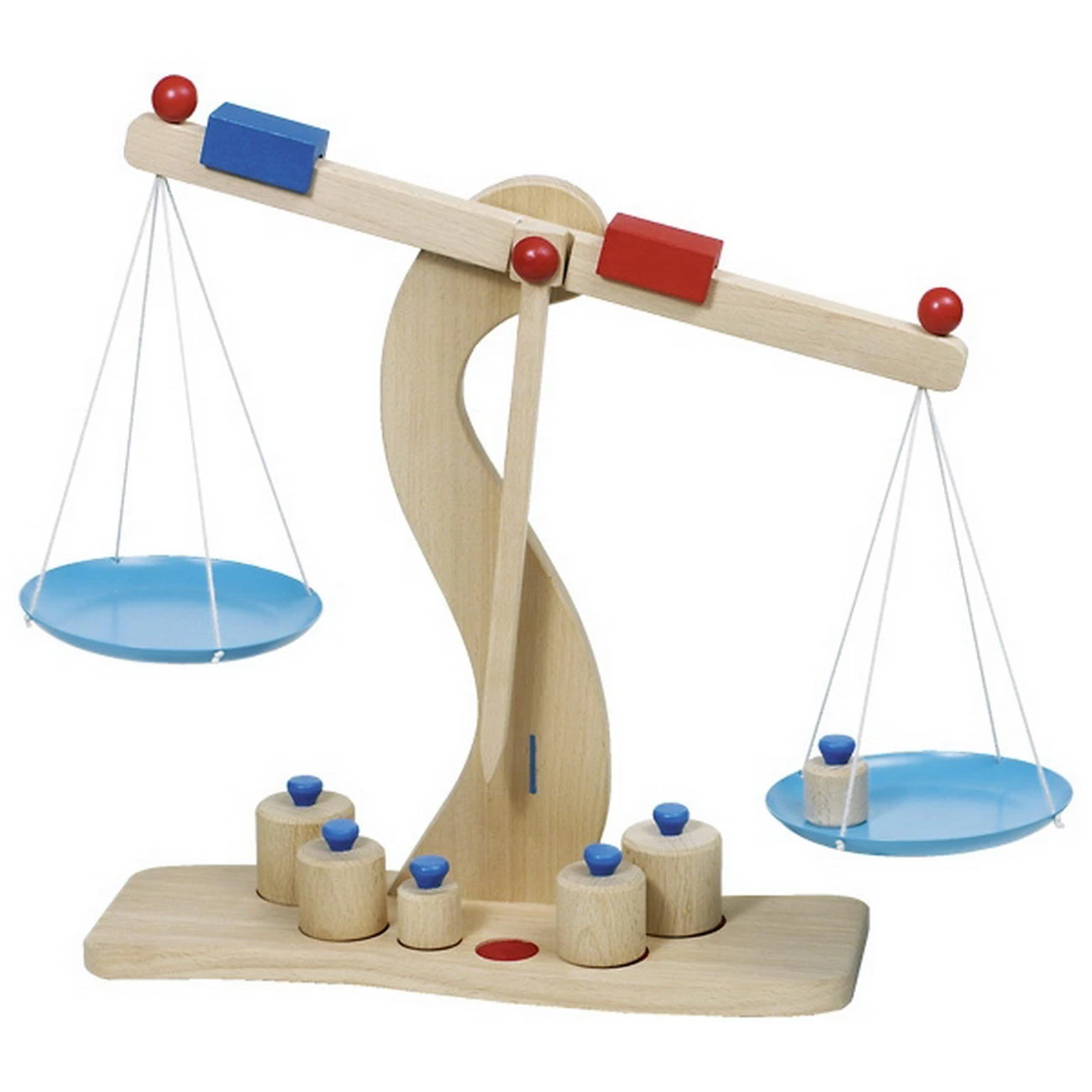 Im Spiel mit einer solchen Balkenwaage können Gewichte und ihre Unterschiede sehr gut sichtbar und erlebbar gemacht werden. Spielen mit Lerneffekt. Mit Waagschalen aus Metall.
